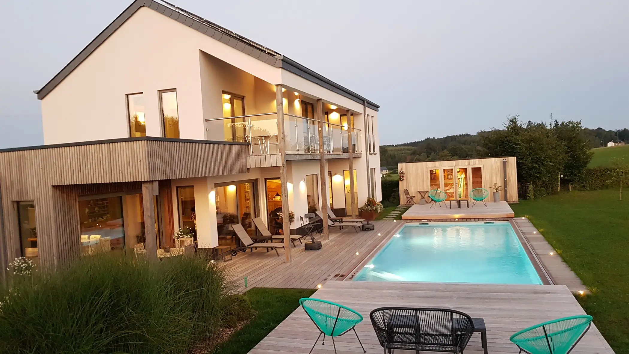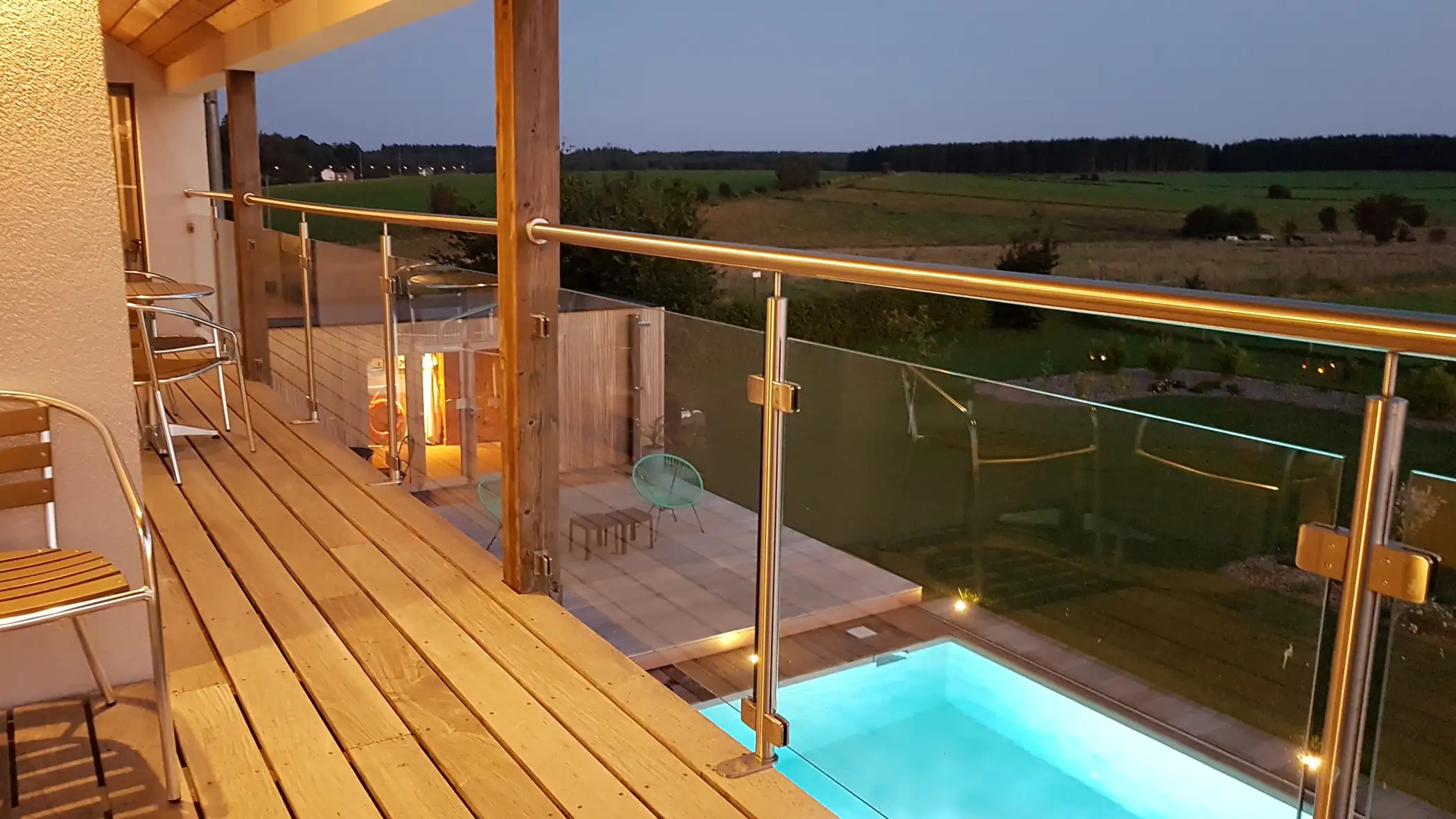 Un paysage à couper le souffle sur la forêt Ardennaise, le chant des oiseaux pour vous éveiller, un petit chemin tranquille pour se balader ou tout simplement, de son balcon privatif, admirer la nature à presque 360° . Un endroit privilégié qui offre un cadre de détente idéal pour se ressourcer tout près de chez vous. Accès gratuit, en saison, à la piscine extérieure chauffée, aux transats et au jardin bénéficiant de plusieurs petits coins de détente ombragés. A l’abri de toute pollution lumineuse, vous pourrez, par une nuit sans nuage de votre terrasse, observer la voie lactée et trouver votre plus belle étoile. Maison bois, basse énergie, construite avec des matériaux écologiques de A à Z dans un esprit Feng Shui, pour un vrai retour à l’essentiel : l’air pur, le calme, la beauté des paysages, la vie en mode ralenti, le ressourcement en forêt, aimer et être aimé … Émerveillements garantis !