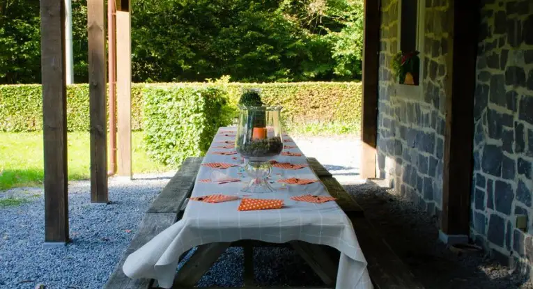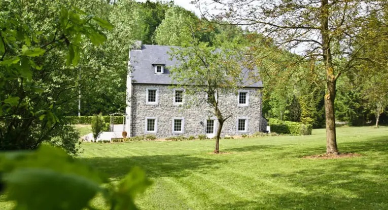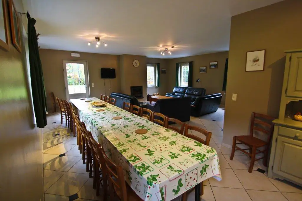 pouvant accueillir à l’aise tous les membres du groupe, une cuisine entièrement équipée, 7 chambres à 2 lits d’une personne et une grande chambre à 6 lits d’une personne, 3 salles de bains et 2 douches privatives. A l’extérieur, vous trouverez une grande table avec son barbecue pour pouvoir passer des soirées inoubliables sous les étoiles et un carport. Cette magnifique propriété entièrement restaurée et tout à fait isolée se situe dans un des « Plus Beaux Villages de Wallonie » et à proximité de la réserve naturelle de Sosoye. A l’orée des bois, avec son très grand jardin elle vous comblera par son charme, sa situation et le grand calme des lieux. Confort, convivialité, nature, vue incroyable sont les mots clés de cet endroit.