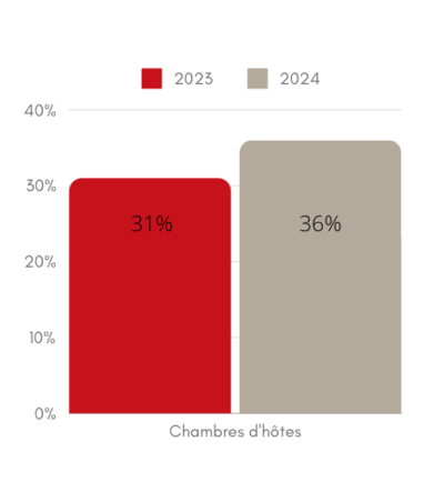 Nos 90 chambres d’hôtes ont affiché un taux d’occupation de 36 % (31 % en 2023). Il s’agit d’une augmentation de 5% par rapport à 2023.