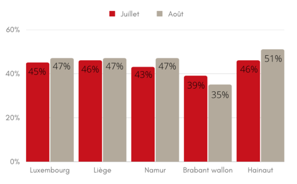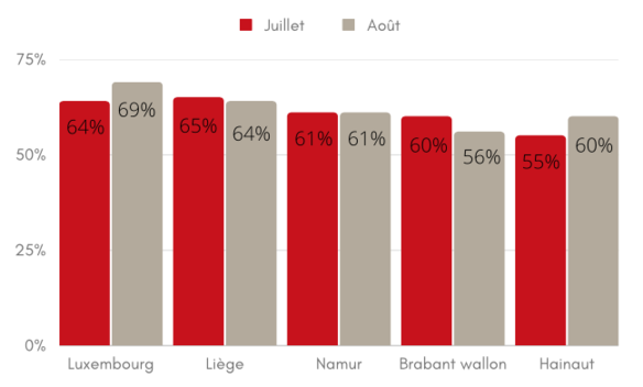 Au niveau des provinces, on constate quelques disparités. Pour le mois de juillet, ce sont les gîtes et meublés de vacances situés sur la province de Liège qui ont affiché le taux d’occupation le plus élevé avec 65% suivi par les provinces de Luxembourg (64%), de Namur (60%), du Brabant wallon (60%) et de Hainaut (55%). Pour le mois d’août, c’est la province de Luxembourg qui a affiché le taux d’occupation le plus élevé avec 69% suvi par les provinces de Liège (64%), de Namur (61%), de Hainaut (60%) et du Brabant wallon (56%).