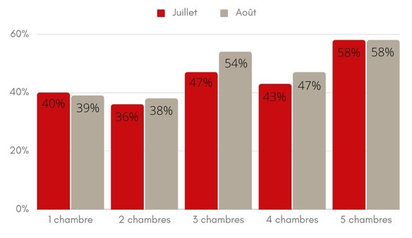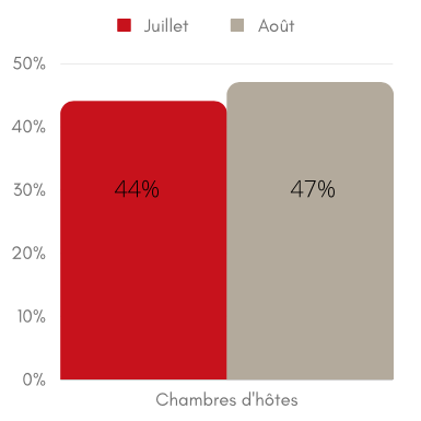 Durant les vacances d’été, nos 90 chambres d’hôtes ont affiché un taux d’occupation de 44% pour le mois de juillet (49% en 2022) et 47% pour le mois d’août (51% en 2022). A nouveau, les chiffres 2022 et 2023 sont donc relativement similaires. Parmi toutes nos chambres d’hôtes, les maisons abritant 5 chambres ont bénéficié d’un meilleur taux d’occupation que la moyenne avec 58 % pour les mois de juillet et d’août.