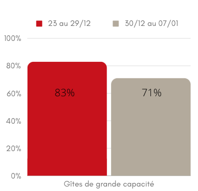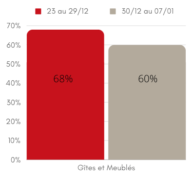 Les vacances d’hiver sont une période prisée pour les réunions familiales ou entre ami.e.s dans de grands gîtes. Cette année, cette tendance n’a pas dérogé à la règle.Parmi les gîtes et meublés de vacances, ils ont affiché les meilleurs taux d’occupation avec 83 % la 1ère semaine (82% en 2022) et 71% la 2e semaine (54% en 2022). Par rapport à 2022, le taux d’occupation de ces hébergements est en légère hausse pour la 1ère semaine (+1 %) mais forte pour la 2e semaine (+17 %).