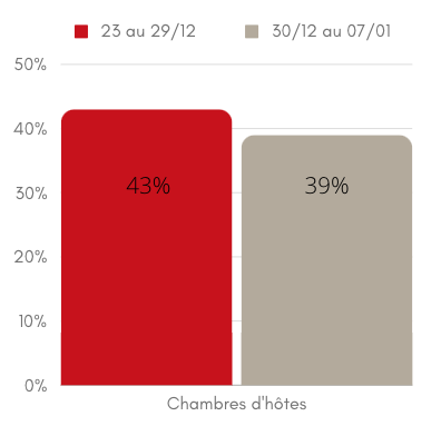 Nos 92 chambres d’hôtes ont affiché un taux d’occupation de 43% la 1ère semaine (49% en 2022) et de 39% la 2e semaine (38% en 2022). Par rapport à 2022, le taux d’occupation de nos chambres d’hôtes est en baisse pour la 1ère semaine (-6 %) mais en très légère hausse pour la 2e semaine (+1 %).