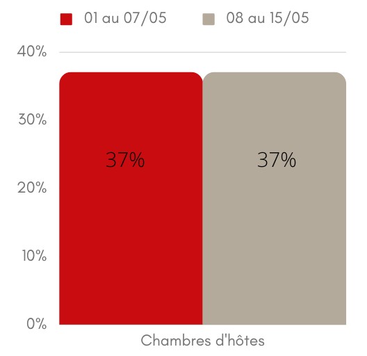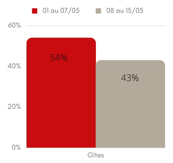 En 2022, à la même période de l’année, nos chambres d’hôtes affichaient un taux d’occupation de 49% la 1ère semaine contre 52% la 2e semaine. Ces chiffres montrent un certain engouement en 2022 pour les chambres chez l’habitant.