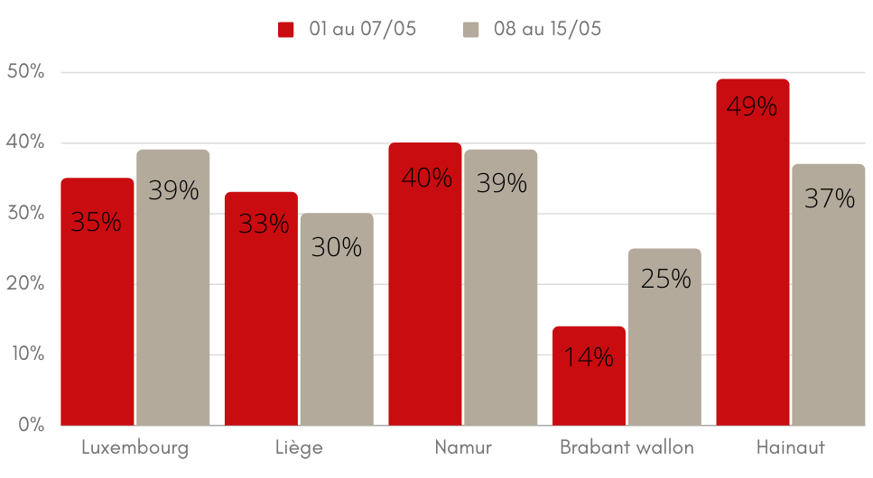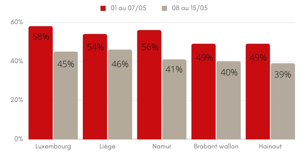 Durant la 1ère semaine des vacances, les gîtes et meublés de vacances situés sur la province de Luxembourg ont affiché le taux d’occupation le plus élevé avec 58% suivi par les provinces de Namur (56%), de Liège (54%), du Brabant wallon (49%) et de Hainaut (49%). Durant la 2e semaine, ce sont les gîtes et meublés situés sur la province de Namur qui ont été le plus occupé (46%) suivi par les province de Luxembourg (45%), de Namur (41%), du Brabant wallon (40%) et de Hainaut (39%)