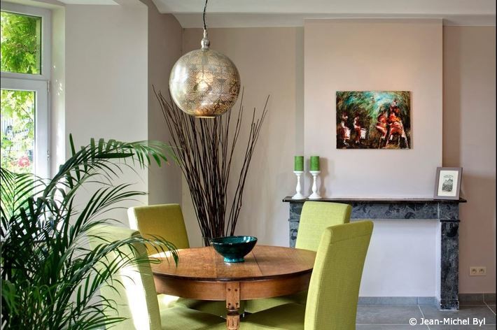 La photo de droite réalisé par le photographe professionnel met bien en valeur la décoration ayant été étudiée avec soin. L’angle de prise de vue permet également de rendre la pièce plus accueillante.