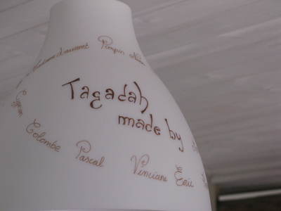 - La lampe de la cuisine toute simple : un marqueur indélébile et un abat-jour de type plastique, le tout assorti de la liste de prénoms de chacune des personnes qui ont mis la main à la pâte dans la rénovation du gîte.