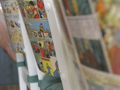 - Fans de bandes dessinées, les planches de vieux albums décorent le mobilier… chaises, table,…
