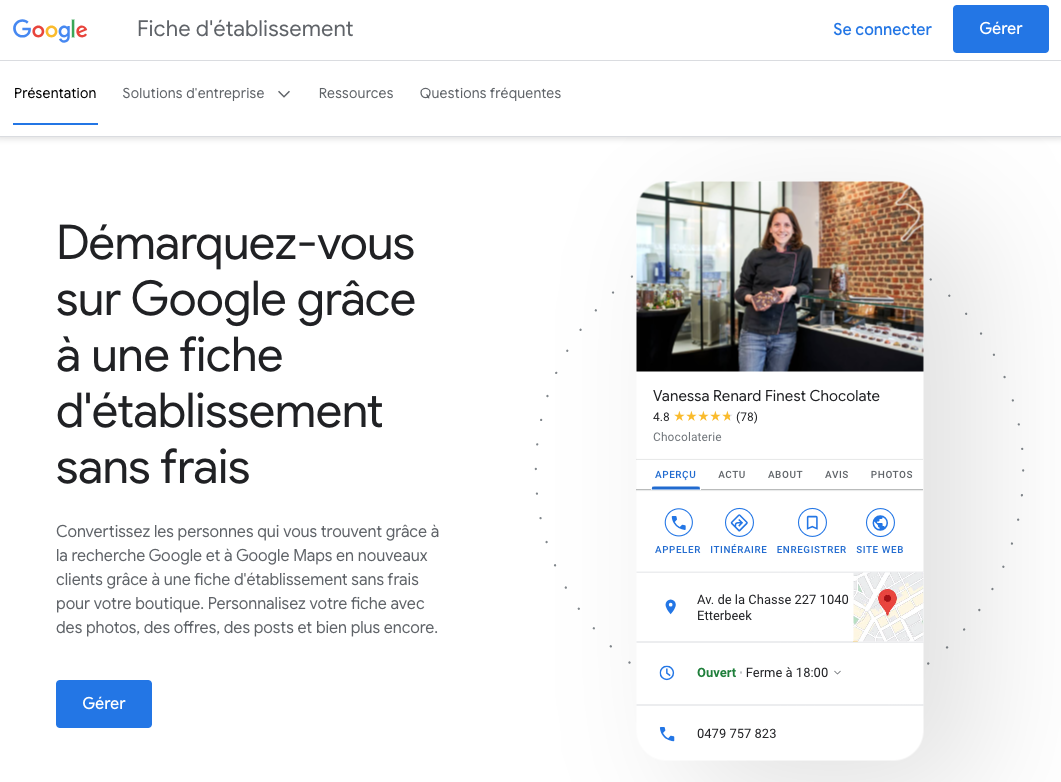 1. Inscription à Google Business Profile : Pour commencer, rendez-vous sur le site de Google Business Profile et cliquez sur « Gérer ». Connectez-vous avec votre compte Google ou créez-en un si vous n’en avez pas.