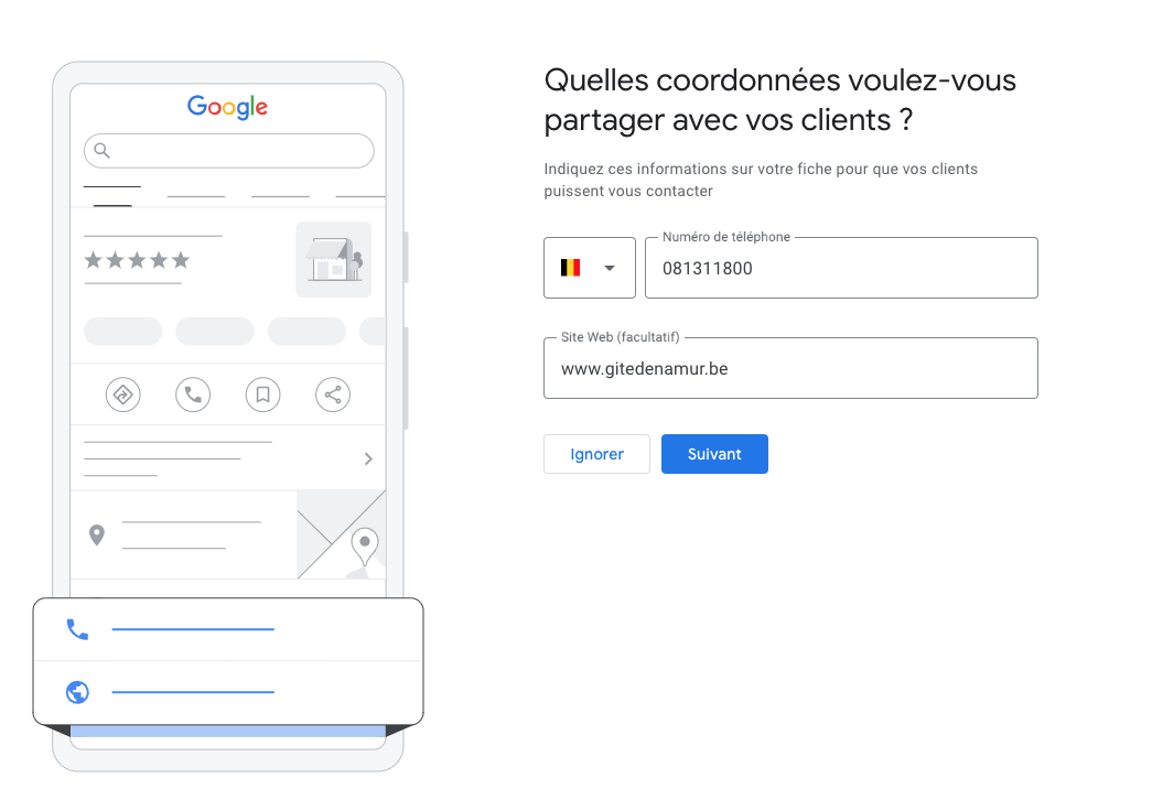 4. Ajouter les coordonnées de contact : Entrez votre numéro de téléphone et l’URL de votre site web. Ces informations permettent aux clients potentiels de vous contacter facilement ou de visiter votre site pour plus de détails.