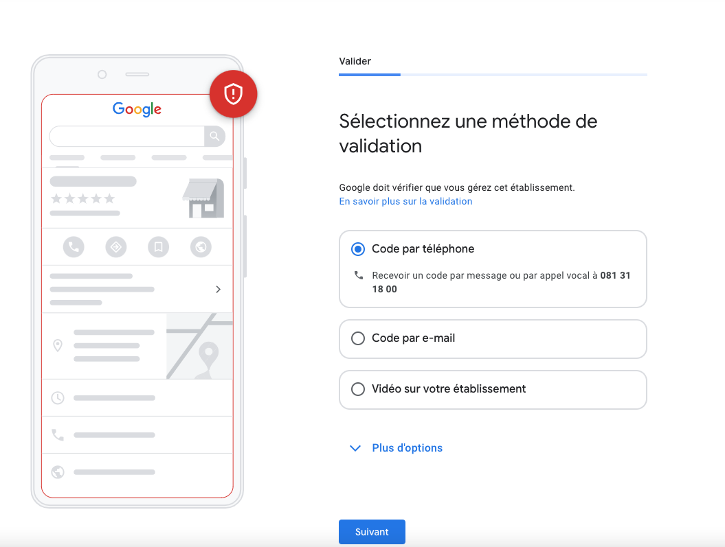 5. Vérification de l’entreprise : Google vous demandera de vérifier votre hébergement pour prouver que vous en êtes bien le propriétaire. La vérification peut se faire par téléphone (appel (vidéo) ou sms) ou email. Suivez les instructions de Google pour compléter ce processus.